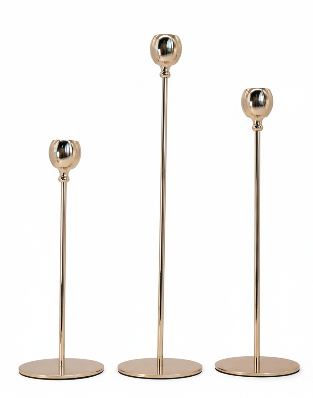 Product ID: A834-1450Refined and radiant, the Auric Stem Taper Candle Holders feature a sleek gold finish with slender stems and classic cup tops. Designed in graduated heights, this trio creates a clean, elevated display that adds warmth and sophistication to any tablescape. Perfect for weddings, event styling, and upscale interiors, these candle holders bring timeless elegance and a polished glow to your decor.