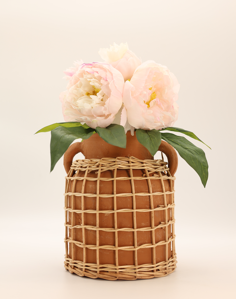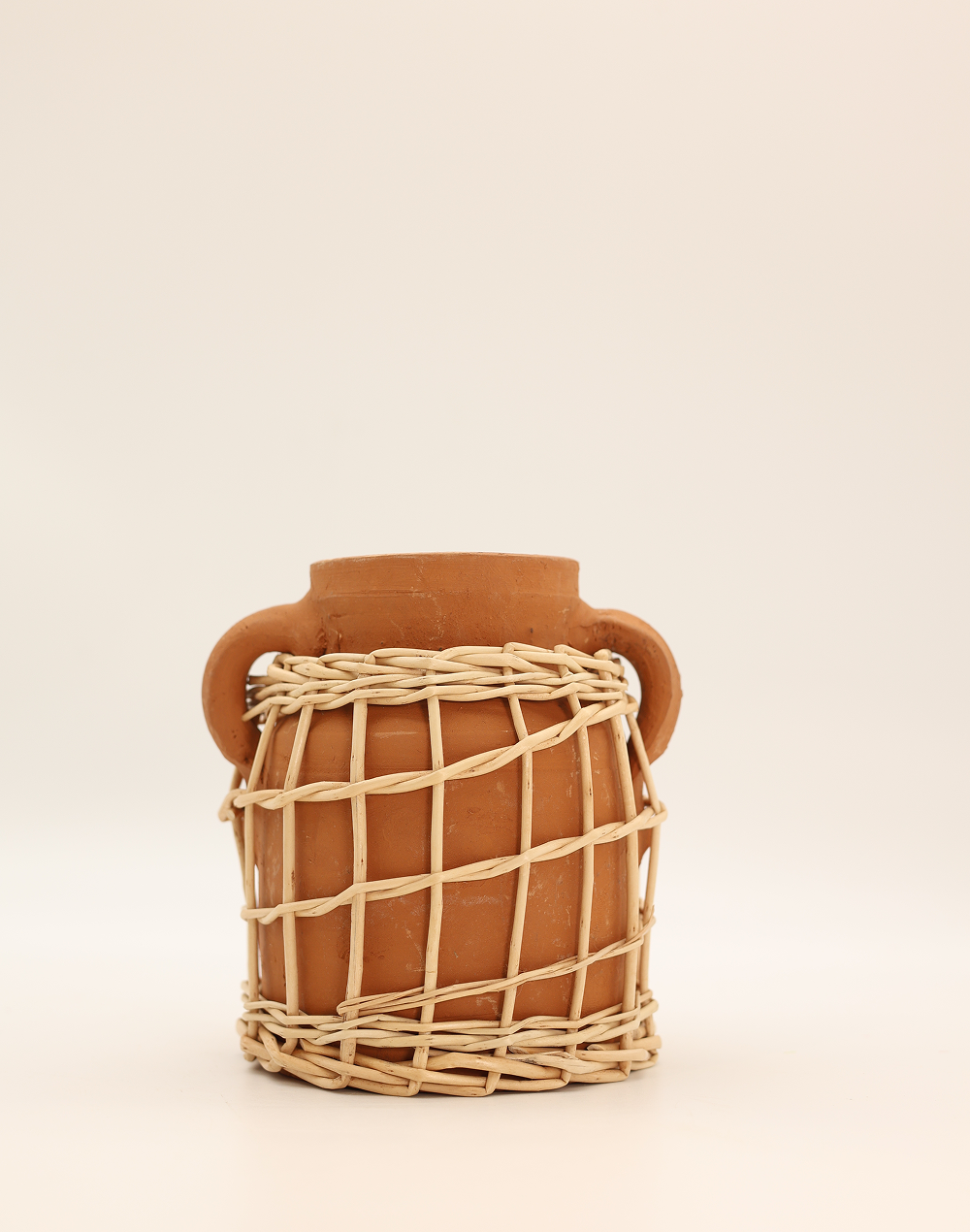 Product ID: 3006A-1331ACharming and full of character, the Double Handle Basket Handle Vase with Woven Detail brings handcrafted warmth to any space. Made from natural terracotta, this compact vase features a rich clay finish, subtle dual side handles, and a handwoven rattan-style wrap that enhances its artisanal appeal. The small, rounded silhouette makes it perfect for petite floral arrangements, shelf styling, or layered table decor. Ideal for boho, rustic, and Mediterranean-inspired interiors, this piece adds texture and authenticity to home decor, weddings, and event centerpieces.